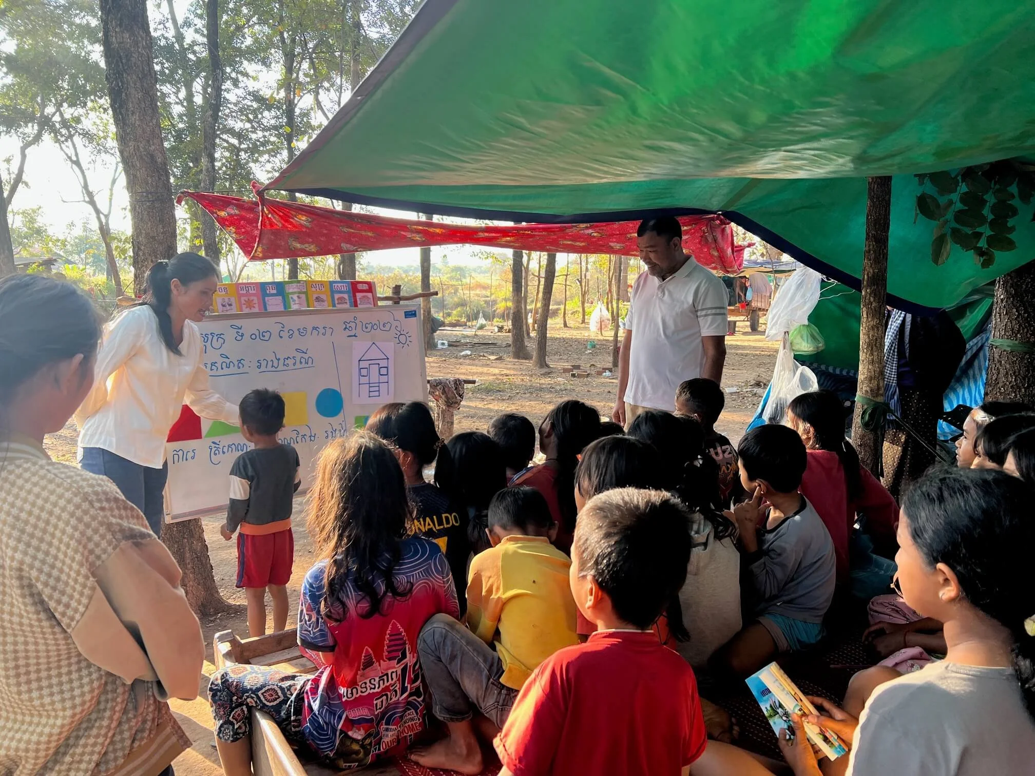 The conditions in these camps are pretty horrendous with families sleeping on the ground under makeshift shelters with only very basic provision of food and sanitary facilities and as you can imagine the kids have very little to keep them occupied. So when Abe and a contingent of our teaching team from Oddar Meanchey turned up for the day recently, they were very well received.